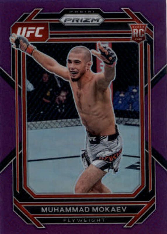 The Muhammad Mokaev 2023 Prizm UFC #124 Purple /149 Rookie card in Raw condition has not changed in price in the last 30 days and was last sold for $4.50 .