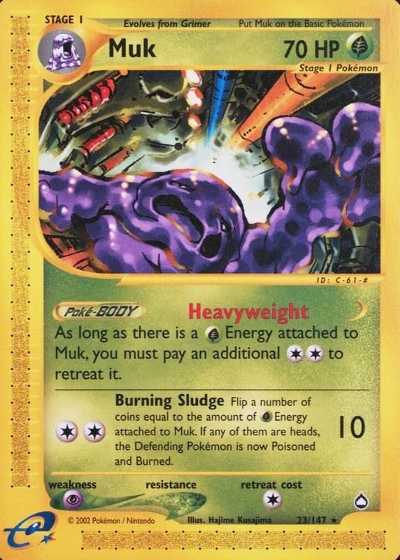 The Muk 2003 Aquapolis #023/147 Base card in Raw TCG (Near Mint) condition has not changed in price in the last 30 days and was last sold for $16.00 .
