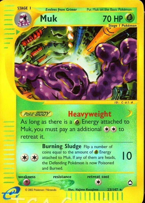 The Muk 2003 Aquapolis #023/147 Reverse Holo card in Raw TCG (Near Mint) condition has not changed in price in the last 30 days and was last sold for $33.44 .