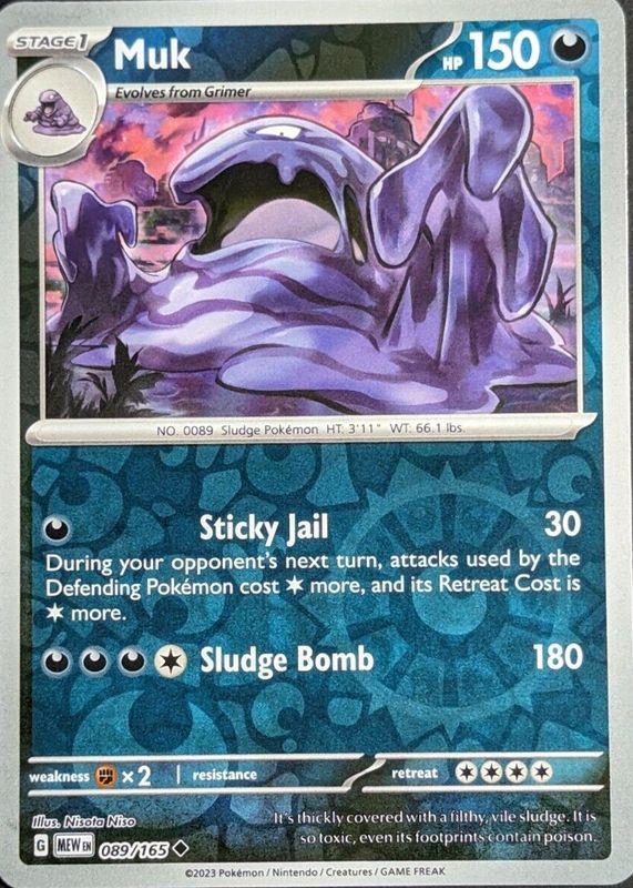 The Muk 2023 Scarlet & Violet: 151 #089/165 Reverse Holo card in Raw TCG (Near Mint) condition has moved down -$0.20 (-10.1%) in the last 30 days and was last sold for $1.79 .