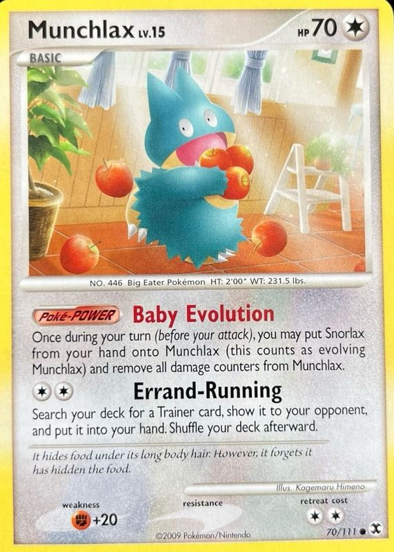 The Munchlax 2009 Platinum: Rising Rivals #070/111 Base card in Raw TCG (Near Mint) condition has moved down -$5.25 (-58.3%) in the last 30 days and was last sold for $3.75 .