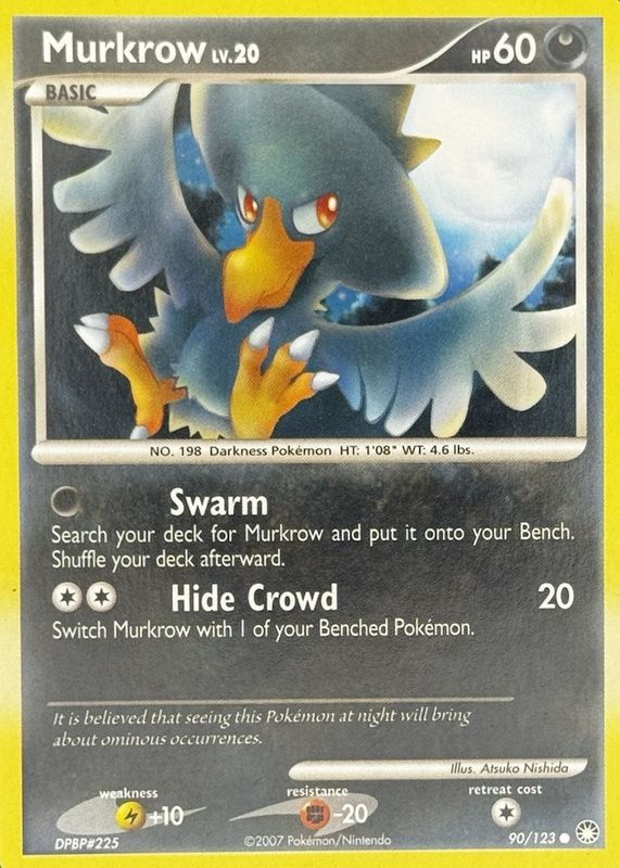 The Murkrow 2007 Diamond & Pearl: Mysterious Treasures #090/123 Base card in Raw TCG (Lightly Played) condition has moved down -$1.01 (-42.3%) in the last 30 days and was last sold for $1.38 .