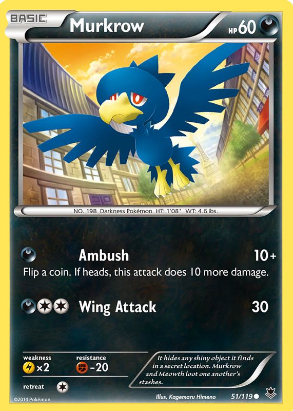The Murkrow 2014 XY: Phantom Forces #051/119 Base card in Raw TCG (Lightly Played) condition has not changed in price in the last 30 days and was last sold for $1.51 .
