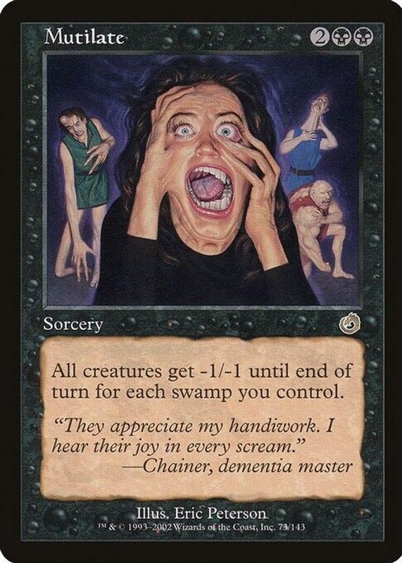 The Mutilate 2002 Torment #73 Base card in Raw TCG (Lightly Played) condition has moved up $0.04 (+1.5%) in the last 30 days and was last sold for $2.65 .