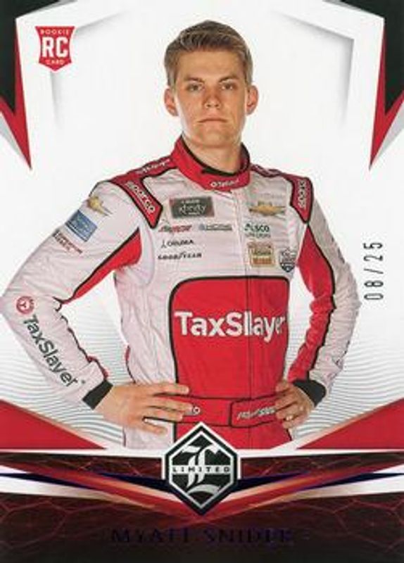 The Myatt Snider 2021 Chronicles NASCAR #3 Limited - Purple /25 Rookie card is 1 of 78 Myatt Snider's card variations in the 2021 Chronicles NASCAR set being tracked by Sports Card Investor, including Absolute, Absolute Autographs, Black Rookie Materials Signatures, Crusade, and Crusade Autographs.