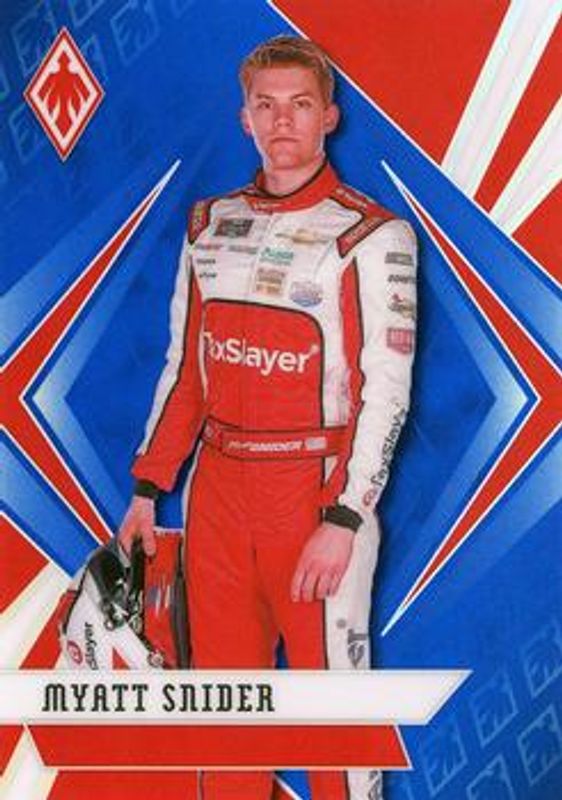 The Myatt Snider 2021 Chronicles NASCAR #8 Phoenix - Blue /199 Rookie card is 1 of 78 Myatt Snider's card variations in the 2021 Chronicles NASCAR set being tracked by Sports Card Investor, including Absolute, Absolute Autographs, Black Rookie Materials Signatures, Crusade, and Crusade Autographs.