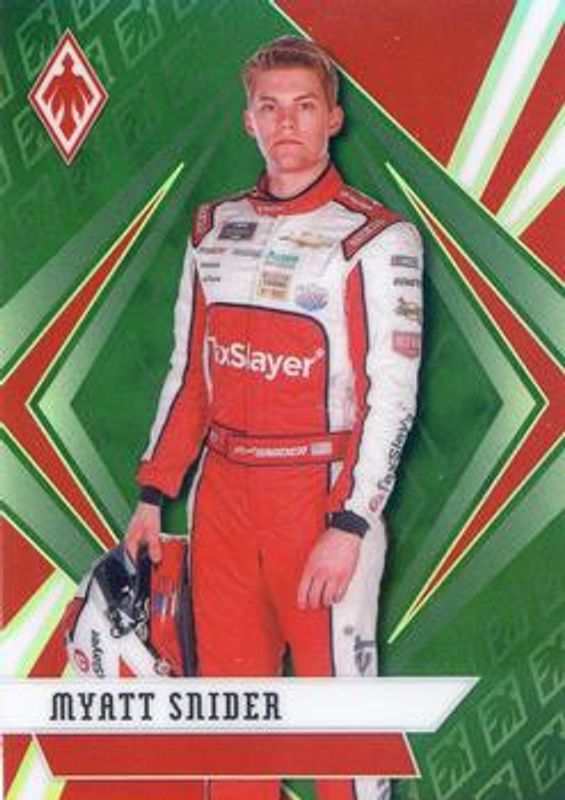 The Myatt Snider 2021 Chronicles NASCAR #8 Phoenix - Green Rookie card is 1 of 78 Myatt Snider's card variations in the 2021 Chronicles NASCAR set being tracked by Sports Card Investor, including Absolute, Absolute Autographs, Black Rookie Materials Signatures, Crusade, and Crusade Autographs.