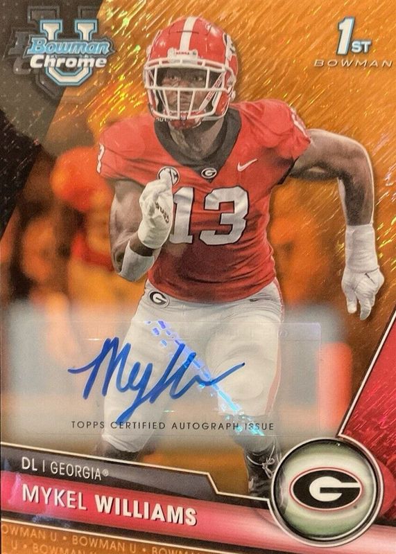 This card is 1 of 12 Mykel Williams' card variations in the 2023 Bowman Chrome University set being tracked by Sports Card Investor, including Prospect Auto (1st), Prospect Auto - Refractor /499 (1st), Prospect Auto - Fuchsia Mini-Diamond Refractor /150 (1st), Prospect Auto - Green Refractor /99 (1st), and Prospect Auto - Yellow Refractor /75 (1st).