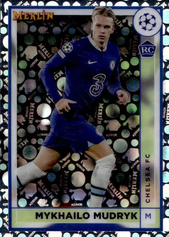 The Mykhailo Mudryk 2022 Topps Merlin Chrome UEFA Club Competitions #41 Vintage Merlin Refractor Rookie card in Raw condition has not changed in price in the last 30 days and was last sold for $3.25 .