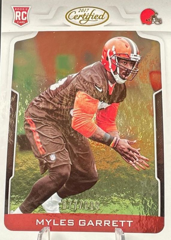 The Myles Garrett 2017 Certified #136 Rookies /999 card in Raw condition has moved up $26.00 (+200%) in the last 30 days and was last sold for $39.00 .