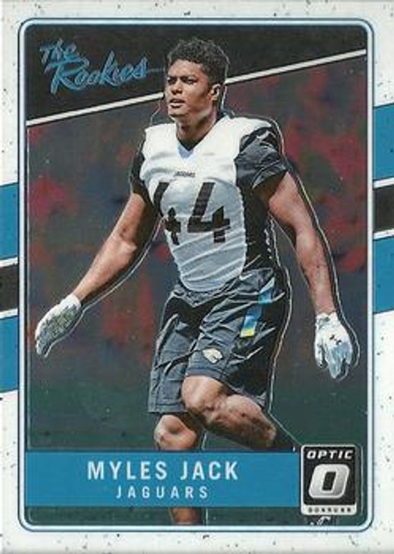 The Myles Jack 2016 Optic #TR-MJ The Rookies card is 1 of 21 Myles Jack's card variations in the 2016 Optic set being tracked by Sports Card Investor, including Base, Bronze, Holo, Pink, and Purple.