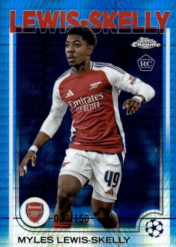 The Myles Lewis-Skelly 2024 Topps Chrome UEFA Club Competitions #154 Blue Prism Refractor /150 Rookie card in Raw condition has not changed in price in the last 30 days and was last sold for $5.00 .