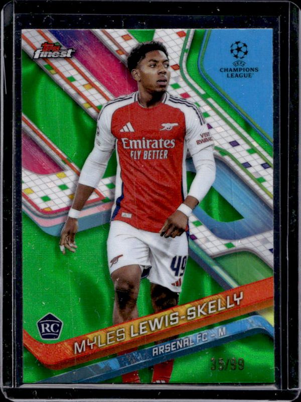 The Myles Lewis-Skelly 2024 Topps Finest UEFA Club Competitions #125 Green Lava Refractor /99 Rookie card is 1 of 42 Myles Lewis-Skelly's card variations in the 2024 Topps Finest UEFA Club Competitions set being tracked by Sports Card Investor, including Base, Refractor, Purple Refractor /299, Sky Blue Refractor /275, and Pink RayWave Refractor /250.