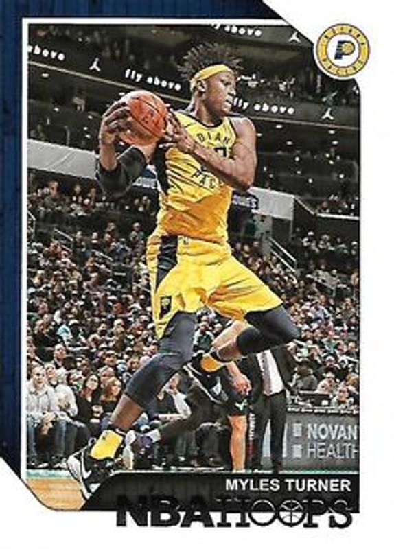 The Myles Turner 2018 Hoops #182 Base card is 1 of 18 Myles Turner's card variations in the 2018 Hoops set being tracked by Sports Card Investor, including Red Backs, Premium Box Set /199, Blue, Purple, and Teal Explosion.