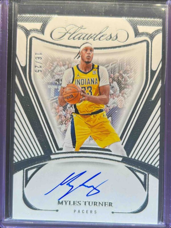 The Myles Turner 2023 Flawless #FA-MTI Flawless Autographs /25 card is 1 of 20 Myles Turner's card variations in the 2023 Flawless set being tracked by Sports Card Investor, including Draft Gem Signatures /25, Flawless Patch Autographs /25, Draft Gem Signatures - Ruby /15, Flawless Autographs - Ruby /15, and Flawless Patch Autographs - Ruby /15.