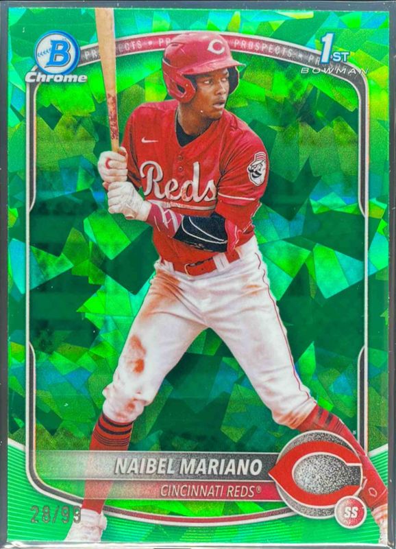 The Naibel Mariano 2025 Bowman Sapphire Edition #BCP-99 Chrome Prospects - Green Refractor /99 card is 1 of 16 Naibel Mariano's card variations in the 2025 Bowman Sapphire Edition set being tracked by Sports Card Investor, including Chrome Prospects, Chrome Prospect Autographs /199, Chrome Prospect Autographs - Green Refractor /99, Chrome Prospects - Yellow Refractor /75, and Chrome Prospect Autographs - Gold Refractor /50.