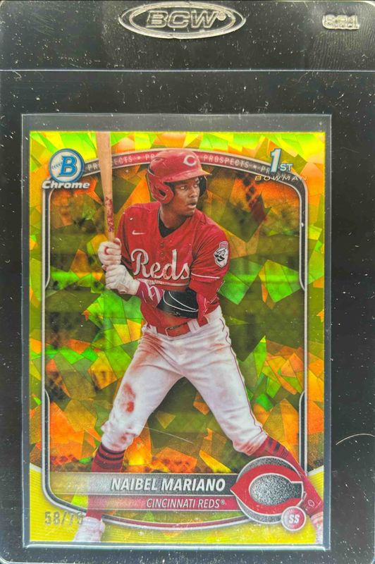 The Naibel Mariano 2025 Bowman Sapphire Edition #BCP-99 Chrome Prospects - Yellow Refractor /75 card is 1 of 16 Naibel Mariano's card variations in the 2025 Bowman Sapphire Edition set being tracked by Sports Card Investor, including Chrome Prospects, Chrome Prospect Autographs /199, Chrome Prospect Autographs - Green Refractor /99, Chrome Prospects - Green Refractor /99, and Chrome Prospect Autographs - Gold Refractor /50.