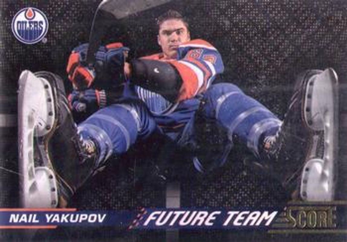 The Nail Yakupov 2013 Score #FS-1 Future Team Score Rookie card is 1 of 10 Nail Yakupov's card variations in the 2013 Score set being tracked by Sports Card Investor, including Base, Black, Gold, Red, and Red Back.
