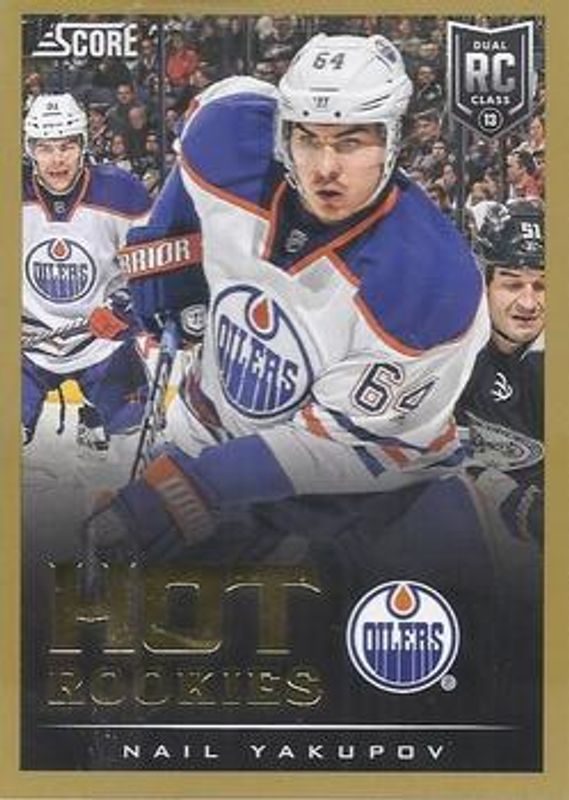 The Nail Yakupov 2013 Score #650 Gold Rookie card is 1 of 10 Nail Yakupov's card variations in the 2013 Score set being tracked by Sports Card Investor, including Base, Black, Red, Red Back, and First Goal.