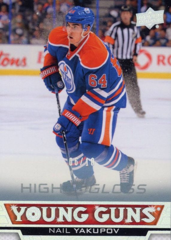 The Nail Yakupov 2013 Upper Deck #241 Young Guns - UD High Gloss /10 Rookie card in Raw condition has not changed in price in the last 30 days and was last sold for $96.97 .