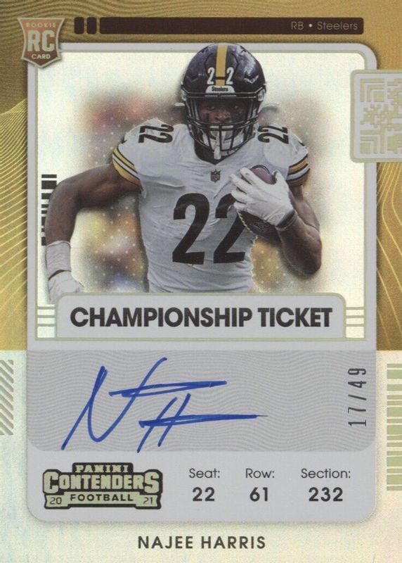 The Najee Harris 2021 Contenders #111 Rookie Ticket Auto - Championship Ticket /49 card in Raw condition has not changed in price in the last 30 days and was last sold for $49.00 .