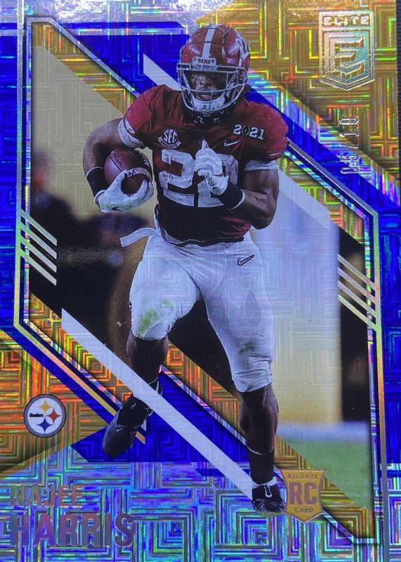 This card is 1 of 20 Najee Harris' card variations in the 2021 Elite set being tracked by Sports Card Investor, including Base Rookie /599, Green, Pink, Aspirations Shimmer /499, and Red /399.