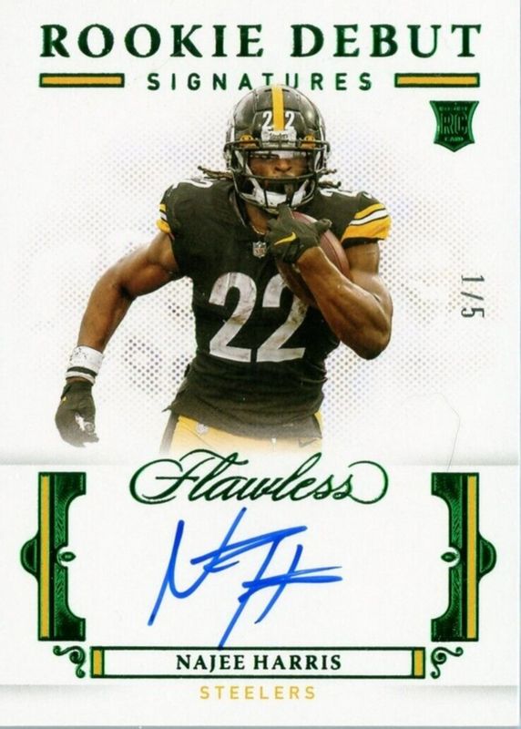 The Najee Harris 2021 Flawless #RDS-NHA Rookie Debut Signatures - Emerald (/5) card in Raw condition has not changed in price in the last 30 days and was last sold for $240.00 .