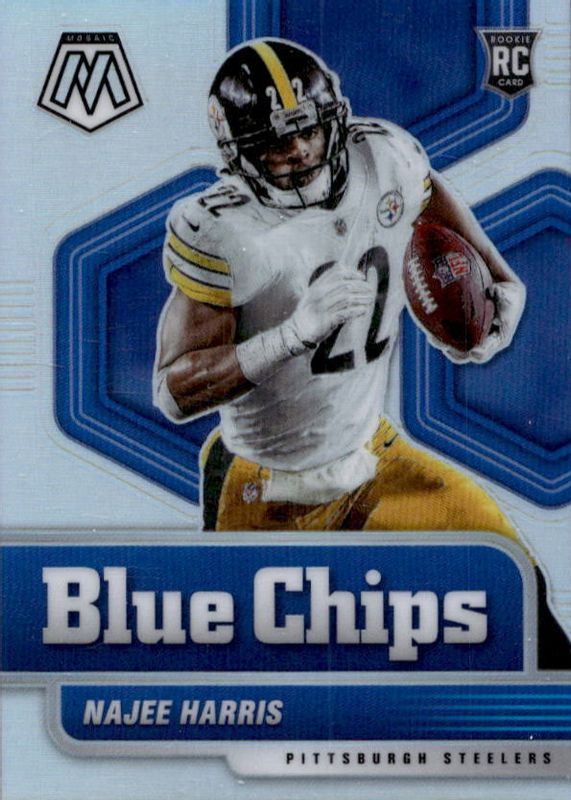 The Najee Harris 2021 Mosaic #12 Blue Chips - Silver Rookie card in Raw condition has not changed in price in the last 30 days and was last sold for $1.25 .