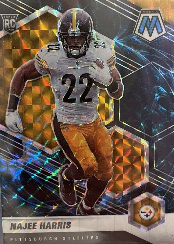 This card is 1 of 94 Najee Harris' card variations in the 2021 Mosaic set being tracked by Sports Card Investor, including Base, Choice Red & Green, Green, No Huddle, and Pink Camo.