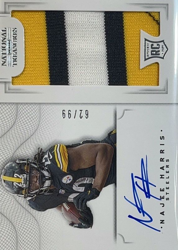 This card is 1 of 57 Najee Harris' card variations in the 2021 National Treasures set being tracked by Sports Card Investor, including Rookie Patch Auto /99, Rookie Patch Auto - Green Jersey Number (/22), Rookie Patch Auto - Purple /49, Rookie Patch Auto - Holo Silver /25, and Rookie Patch Auto - Stars & Stripes Holo Silver /25.