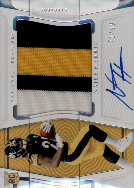 This card is 1 of 57 Najee Harris' card variations in the 2021 National Treasures set being tracked by Sports Card Investor, including Rookie Patch Auto /99, Rookie Patch Auto - Green Jersey Number (/22), Rookie Patch Auto - Purple /49, Rookie Patch Auto - Holo Silver /25, and Rookie Patch Auto - Stars & Stripes Holo Silver /25.