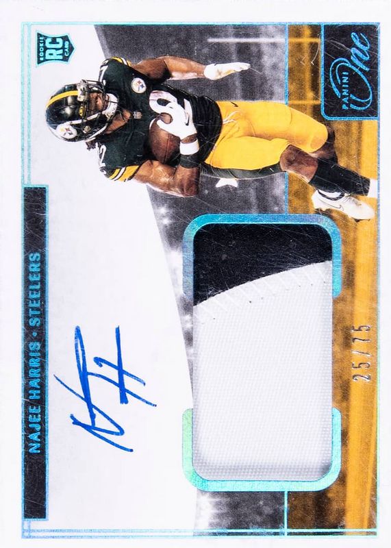 The Najee Harris 2021 One #13 Rookie Patch Auto - Blue (/75) card in Raw condition has not changed in price in the last 30 days and was last sold for $75.00 .