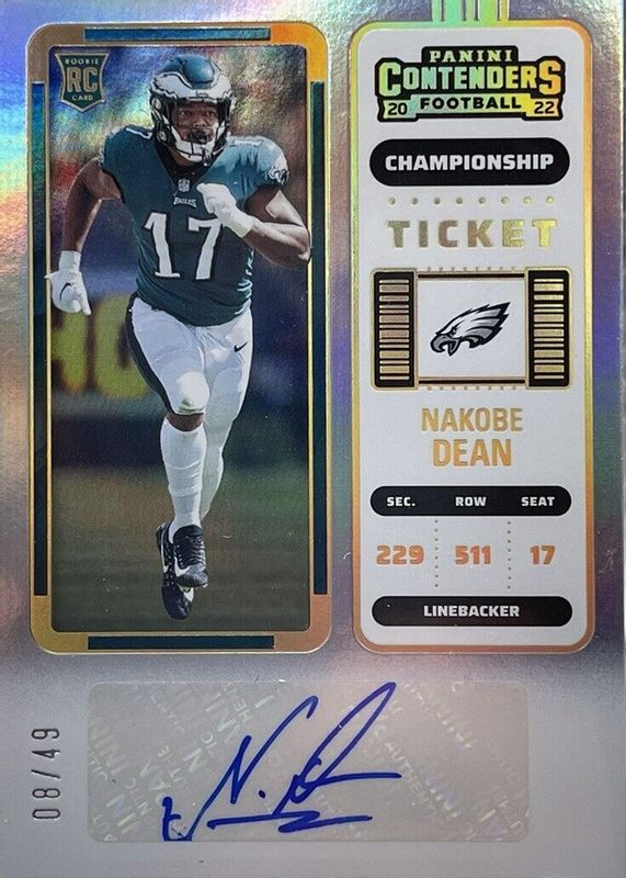 2022 Contenders Nakobe Dean Championship Ticket Rookie Auto RC #23/49 Eagles