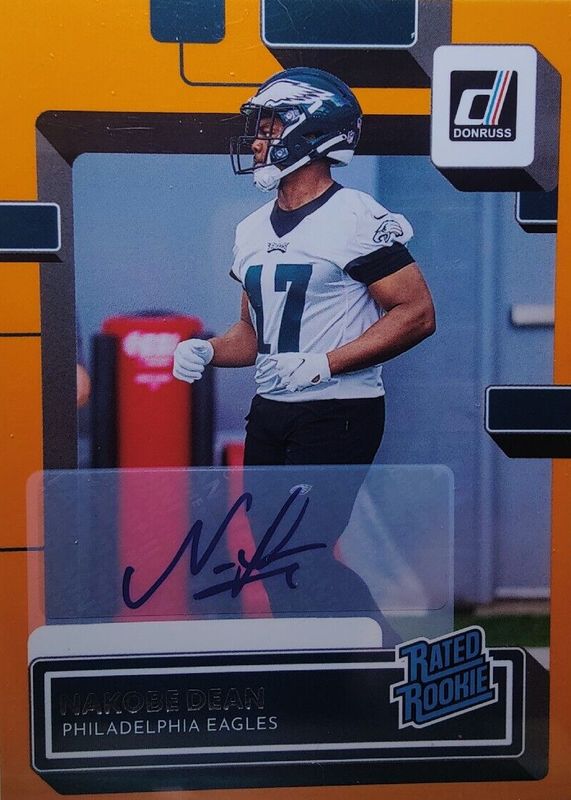 The Nakobe Dean 2022 Donruss #387 Rated Rookie Autographs - Orange card in Raw condition has not changed in price in the last 30 days and was last sold for $12.50 .