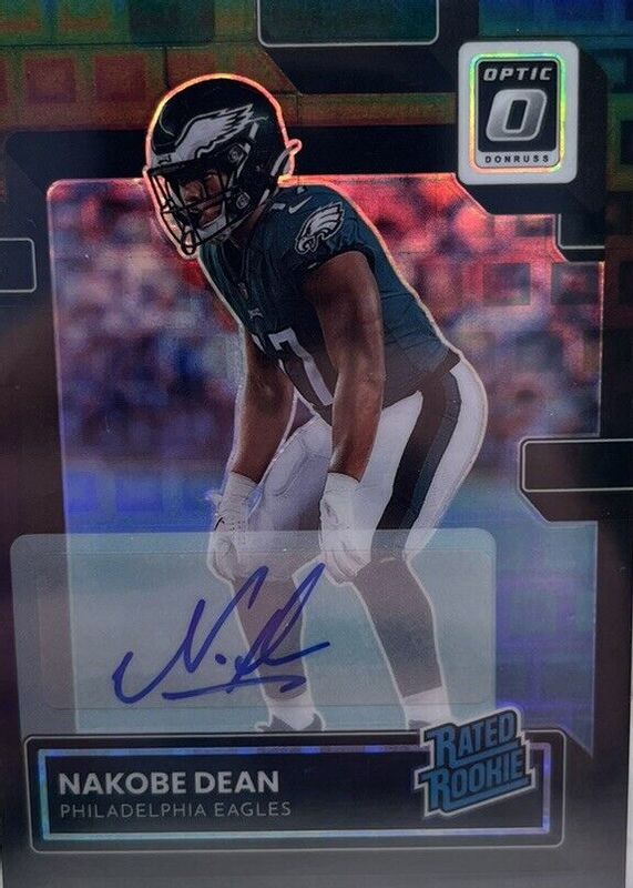 This card is 1 of 13 Nakobe Dean's card variations in the 2022 Optic set being tracked by Sports Card Investor, including Rated Rookie Autographs - Purple Stars (/10), Rated Rookie Autographs /150, Rated Rookie Autographs - Holo /125, Rated Rookie Autographs - Blue /99, and Rated Rookie Autographs - Red /75.