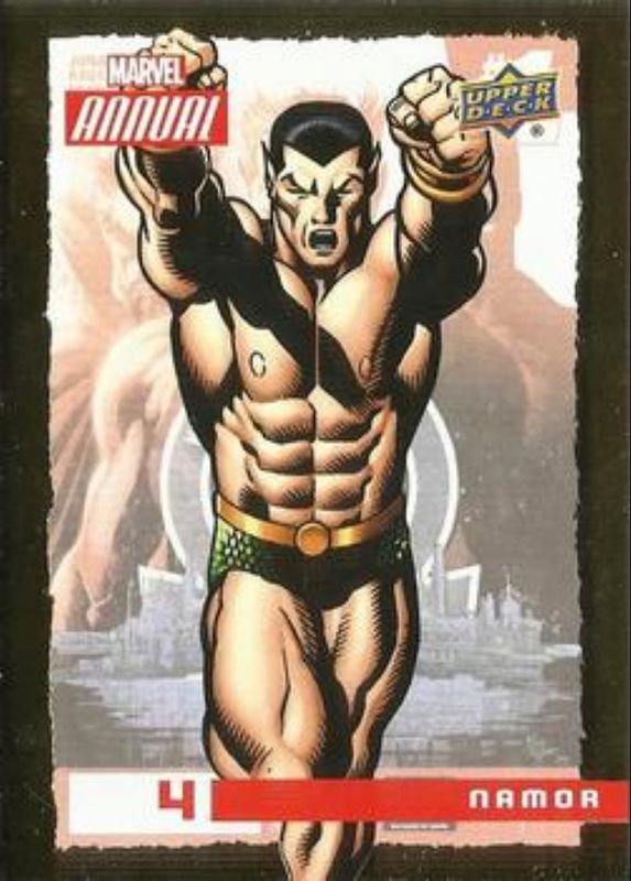 The Namor 2020 Upper Deck Marvel Annual #4 Gold card is 1 of 8 Namor's card variations in the 2020 Upper Deck Marvel Annual set being tracked by Sports Card Investor, including Base, Red, Printing Plate Black /1, Printing Plate Cyan /1, and Printing Plate Magenta /1.
