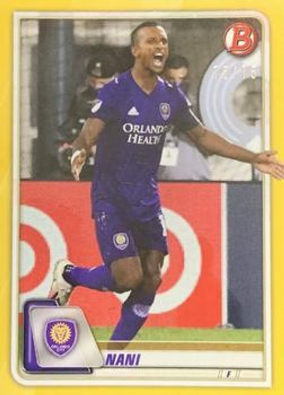 The Nani 2020 Bowman MLS #98 Yellow /75 card is 1 of 8 Nani's card variations in the 2020 Bowman MLS set being tracked by Sports Card Investor, including Base, Blue /150, Gold /50, Orange /25, and Red /5.