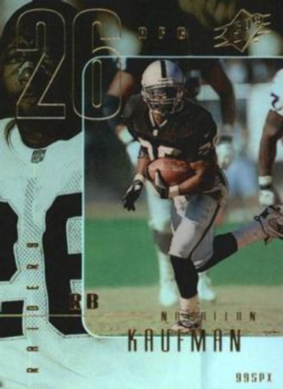 The Napoleon Kaufman 1999 SPx #64 Base /1999 card is 1 of 5 Napoleon Kaufman's card variations in the 1999 SPx set being tracked by Sports Card Investor, including Radiance /100, Spectrum /1, Prolifics, and SPxcitement.