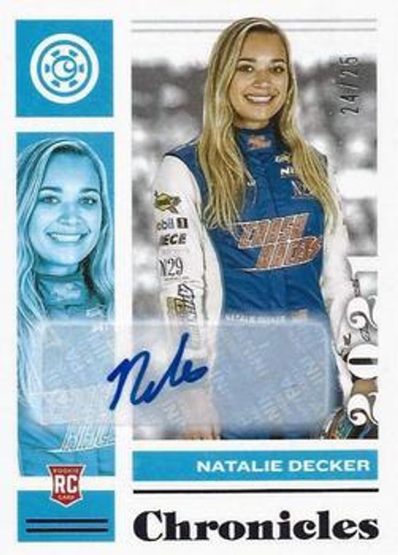The Natalie Decker 2021 Chronicles NASCAR #10 Chronicles Autographs - Purple /25 Rookie card is 1 of 85 Natalie Decker's card variations in the 2021 Chronicles NASCAR set being tracked by Sports Card Investor, including Base, Blue /199, Red /99, Purple /25, and Gold /10.