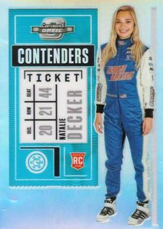 The Natalie Decker 2021 Chronicles NASCAR #13 Contenders Optic - Holo Rookie card is 1 of 85 Natalie Decker's card variations in the 2021 Chronicles NASCAR set being tracked by Sports Card Investor, including Base, Blue /199, Red /99, Purple /25, and Gold /10.