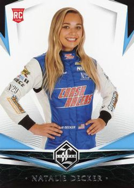 The Natalie Decker 2021 Chronicles NASCAR #1 Limited Rookie card is 1 of 85 Natalie Decker's card variations in the 2021 Chronicles NASCAR set being tracked by Sports Card Investor, including Base, Blue /199, Red /99, Purple /25, and Gold /10.