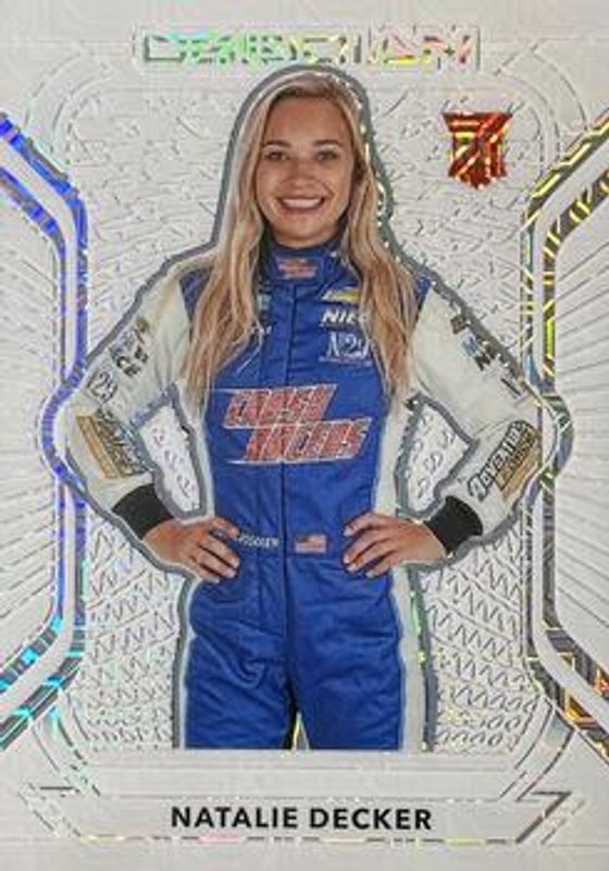 The Natalie Decker 2021 Chronicles NASCAR #15 Obsidian - Electric Etch White Mojo /1 Rookie card is 1 of 85 Natalie Decker's card variations in the 2021 Chronicles NASCAR set being tracked by Sports Card Investor, including Base, Blue /199, Red /99, Purple /25, and Gold /10.