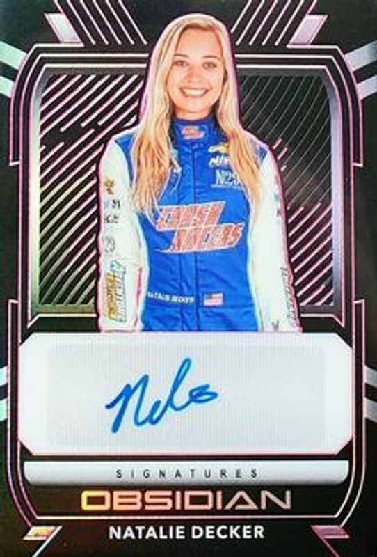 The Natalie Decker 2021 Chronicles NASCAR #OS-ND Obsidian Signatures - Electric Etch Pink /25 Rookie card is 1 of 85 Natalie Decker's card variations in the 2021 Chronicles NASCAR set being tracked by Sports Card Investor, including Base, Blue /199, Red /99, Purple /25, and Gold /10.