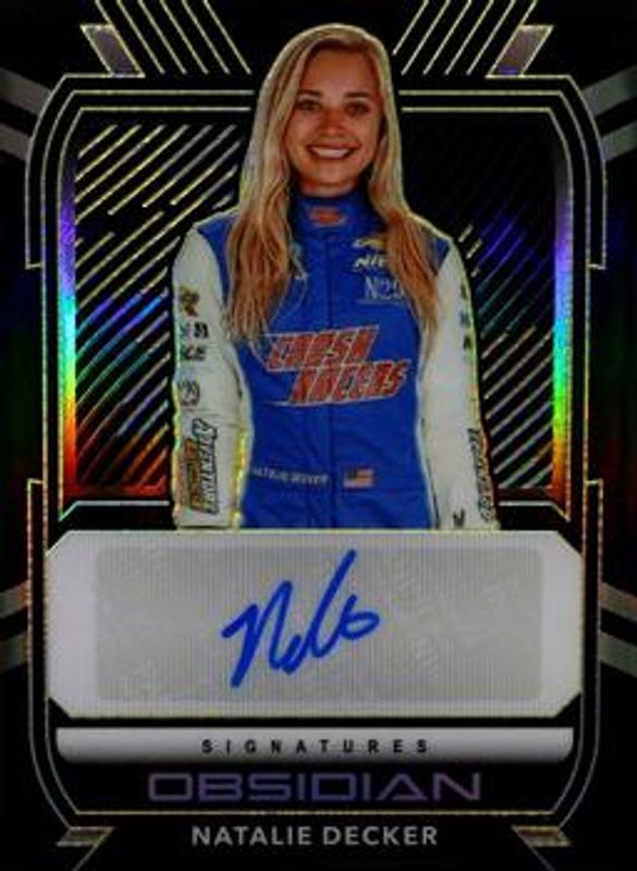 The Natalie Decker 2021 Chronicles NASCAR #OS-ND Obsidian Signatures - Electric Etch Yellow /10 Rookie card is 1 of 85 Natalie Decker's card variations in the 2021 Chronicles NASCAR set being tracked by Sports Card Investor, including Base, Blue /199, Red /99, Purple /25, and Gold /10.
