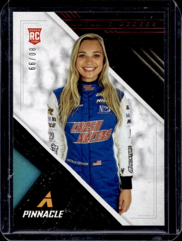 The Natalie Decker 2021 Chronicles NASCAR #15 Pinnacle - Red /99 Rookie card is 1 of 85 Natalie Decker's card variations in the 2021 Chronicles NASCAR set being tracked by Sports Card Investor, including Base, Blue /199, Red /99, Purple /25, and Gold /10.