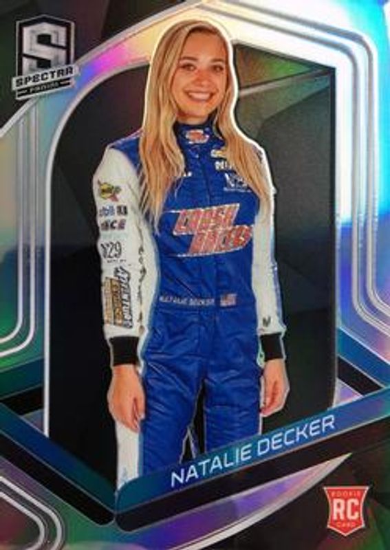 The Natalie Decker 2021 Chronicles NASCAR #65a Spectra Rookie card is 1 of 85 Natalie Decker's card variations in the 2021 Chronicles NASCAR set being tracked by Sports Card Investor, including Base, Blue /199, Red /99, Purple /25, and Gold /10.