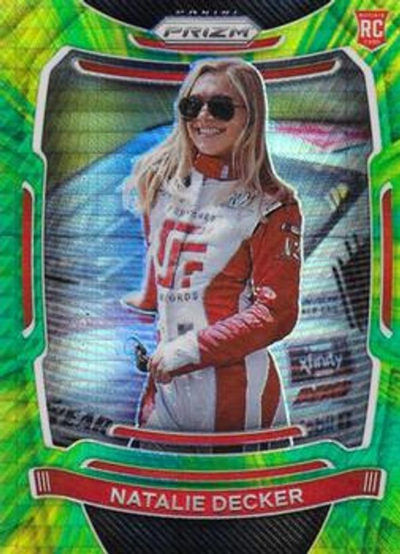 The Natalie Decker 2021 Prizm NASCAR #60a Hyper Green & Yellow Rookie card is 1 of 75 Natalie Decker's card variations in the 2021 Prizm NASCAR set being tracked by Sports Card Investor, including #60a Base, #60b Base, #60b Blue, #60a Blue, and #60a Hyper Blue & Carolina Blue.