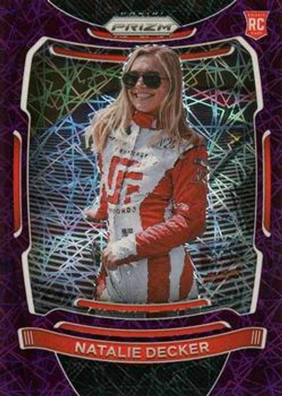 The Natalie Decker 2021 Prizm NASCAR #60a Purple Velocity /199 Rookie card is 1 of 75 Natalie Decker's card variations in the 2021 Prizm NASCAR set being tracked by Sports Card Investor, including #60a Base, #60b Base, #60b Blue, #60a Blue, and #60a Hyper Blue & Carolina Blue.