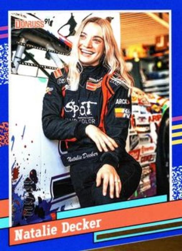 The Natalie Decker 2024 Donruss NASCAR #127 Blue /199 card is 1 of 43 Natalie Decker's card variations in the 2024 Donruss NASCAR set being tracked by Sports Card Investor, including Base, Optic, Optic Black Pandora, Optic Blue Velocity, and Optic Holo.