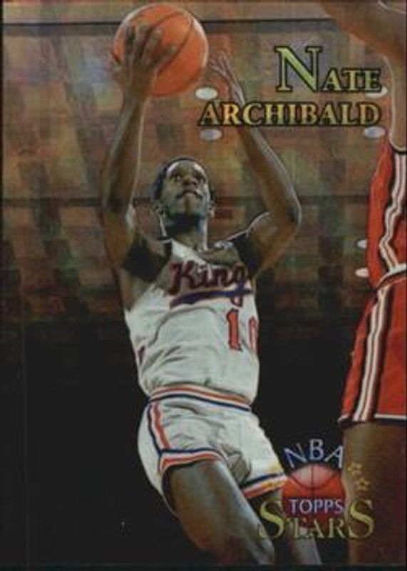 The Nate Archibald 1996 Topps Stars #102 Finest Atomic Refractor card is 1 of 20 Nate Archibald's card variations in the 1996 Topps Stars set being tracked by Sports Card Investor, including #2 Base, #102 Base, #52 Base, #102 Finest, and #2 Finest.